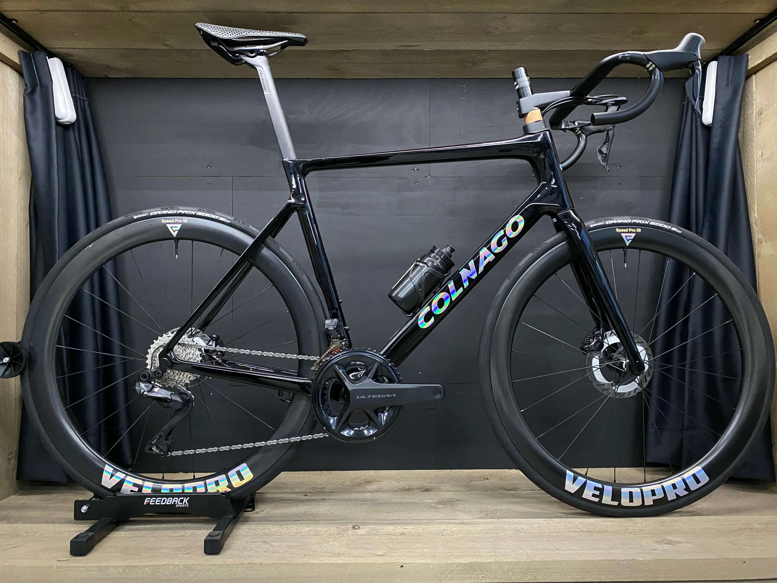 Colnago V4RS Ultegra Di2 aero en stijve racefiets: 798g carbon racefiets voor profs zoals Pogačar. Ultegra Di2 2×12, VELOPRO Speed Pro 50 wielen.