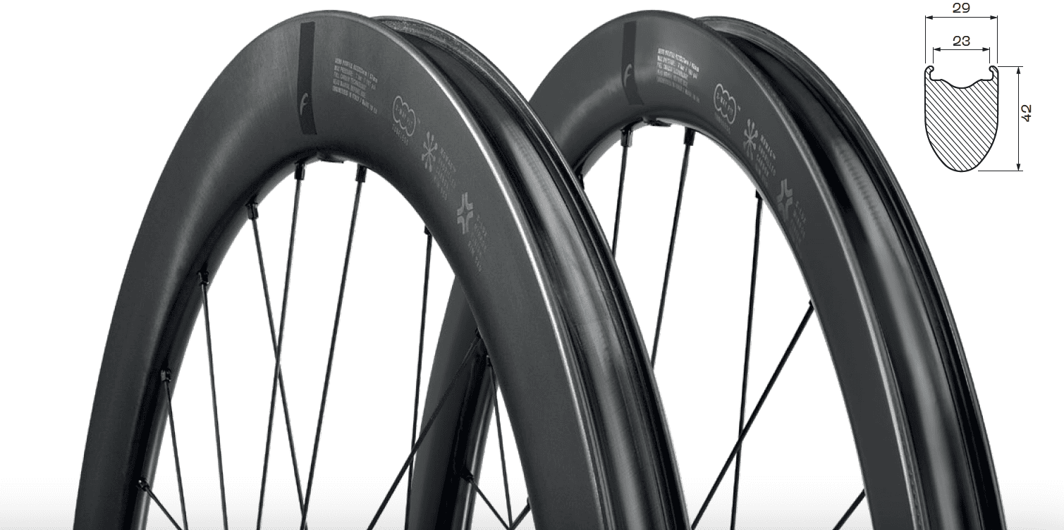 Volledig carbon velgen – 42 mm profiel: Aerodynamisch, stabiel en modern, met een interne breedte van 23 mm en geschikt voor banden van 25 tot 69 mm.